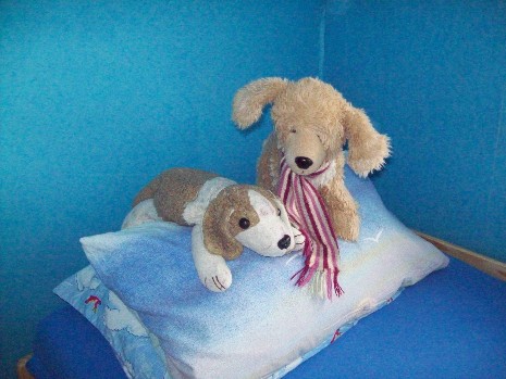 Bobby, den linken, schon sehr kaputtgeliebten Hund hab ich von meiner Freundin bekommen, als ich in die Lehre kam (ca. 40 km entfernt) - damit ich ein Andenken an daheim habe..... Und bei einem Besuch hat sie dann mal festgestellt, wie fertig und abgenutzt Bobby nun schon aussieht - da brachte sie mir Luna mit. Und da ich so ein treues Wesen bin, bringe ich es einfach nicht übers Herz Bobby einfach so auszumustern und habe nun zwei Kuscheltiere im Bett (nagut, meistens drei, denn mein Sohn will meistens bei mir schlafen *g*)