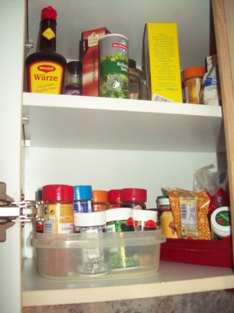 Eeeeeendlich löse ich meine Zeigeschulden bei Vodia noch ein... ich komm grad zu gar nichts... Entschuldige bitte, daß es so lange gedauert hat. (Und eigentlich hat es sich nicht wirklich gelohnt drauf zu warten - völlig unspektakulär *g*)Ich hab einfach die ganz normalen Gewürzdöschen in eine Schachtel gestellt und fertig, viel benutze ich eh nicht....