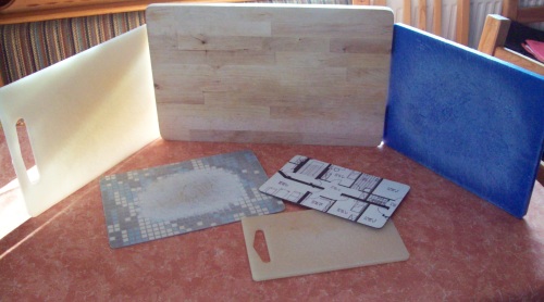 Pat wollte gerne meine Frühstücksbrettchen sehen. Öhemmmm, das wäre ein weißer Fleck geworden - ich mag keine Brettchen, ich frühstücke nur vom Teller oder aus der Müslischale (oder gleich aus der Hand *gg*) Aber lieb wie Kerki ist durfte ich auch die Schneidebrettchen zeigen ;-)) DA hab ich welche: