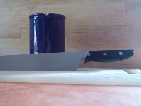 Beim fotografieren der Schneidebretter fiel mir mein Lieblingsmesser dazu ein... Uralt (aus dem Messerkoffer meines Mannes, der wir vor etwa 22 Jahren gekauft hatten) und durch den beinahe täglichen Gebrauch hat das gute Stück doch sehr gelitten - aber ich bringe es nicht übers Herz, es einfach wegzuwerfen.... Genausowenig wie die Tasse (die nur ein Beispiel ist, ich hab noch mehr so angeschlagene Dinge im Schrank) Da hängen an jedem Stück Erinnerungen und ich bin das halt einfach so gewöhnt....