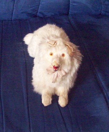 Mittlerweile ist von weiß nicht mehr wirklich viel zu sehen, aber wenn man so viele Jahre auf dem Buckel hat, darf man schon ein bißchen angeschmuddelt sein. Er müßte nun mindestens 50, 60 Jahre alt sein. Die Ohren und die Schnauze sind auch nicht mehr so ganz in Ordnung - aber Fipsi erinnert mich immer wieder an meine Oma und drum darf er seinen Platz in meiner Vitrine auch behalten ;-))