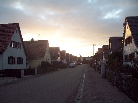 Die Straße in der ich wohne... nunja, jedenfalls die Hälfte nach Westen hin. Unser Häuschen liegt ziemlich in der Mitte ;-)) Wir wohnen in einer ganz netten, ruhigen Wohnsiedlung. Die nächsten Nachbarn kenne ich noch, ein paar Häuser weiter wirds schon schwieriger ;-)) Aber so einen Ratsch über den Gartenzaun machen wir immer wieder gerne!