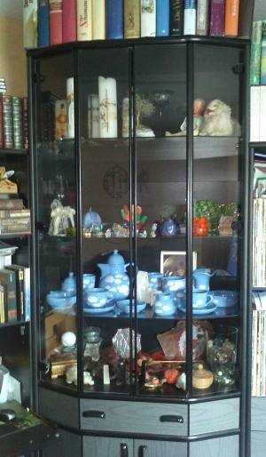 Und natürlich sind viele andere Erinnerungen in dieser Vitrine... Ganz rechts oben liegt Fipsy, ein wuschliger Hund, den meine Oma schon als Kind besaß, daneben eine Puppe, die meiner anderen Oma gehörte... den Perlenbaum hab ich höchstpersönlich mal gemacht, keine Ahnung, woher ich so eine endlose Geduld hatte ;-))