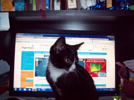 Denn auf einmal springt Socke vom Hocker auf meinen Schoß, klettert dann auf meine Schulter und beobachtet erst mal von sicherer Höhe, was da so vor sich geht... dann läßt er sich langsam auf den Schreibtisch runter und macht sich auf dem Mousepad breit... um kurz drauf direkt vor dem Monitor zu sitzen, so daß ICH fast nichts mehr sehen kann ;-))