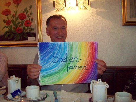 Brigida hat mich - bei strömendem Regen - abgeholt und auf gings nach Bad Wörishofen. Nach einem kurzen Umweg zum falschen Cafe (tja, was man so alles in grad mal 28 Jahren vergißt *lach*) kamen wir zwei dann als erste an. Kurz drauf kamen Angelika (Kassiopeia) mit Dietmar und Sylvia mit Klaus dazu. Angelika hat ganz liebevoll ein tolles Seelenfarben-Plakat gemalt. Dietmar wurde gleich genötigt, das in die Kamera zu halten *lach*