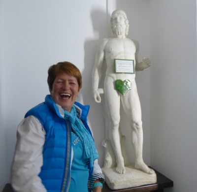 Dort, auf dem Damenklo, steht ein Adonis mit einem Feigenblatt... Und darüber ein Schild „Bitte Feigenblatt nicht anheben“ Bisher hab ich mich auch nie getraut, das Blättlein zu lupfen... Erstens: Warum auch? Und Zweitens: Gerüchte gehen umher, daß dann in dem (fast immer rammelvollen) Wirtshaus eine Sirene oder ein Blaulicht angeht oder irgendsoetwas...