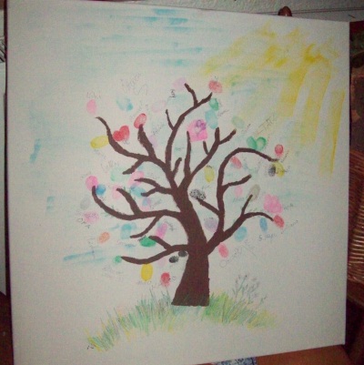 Eine ganz arg liebe Geste war es, ein Bild eines Baumes auszulegen mit vielen Ästen und dazu viel bunte Stempelkisselchen.. Und jeder Gast hat sich mit Fingerabdruck und Unterschrift darauf verewigt. Am Schluß hat unser Künstler Rosario das Bild noch richtig wunderschön vervollständigt mit Himmel, Sonne und Wiese... Was für eine tolle Erinnerung!