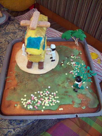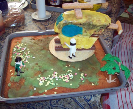 Nun kommt das Schwerste daran: Den Hubschrauber entweder mit gefärbtem Marzipan verkleiden oder mit Zuckerguß überziehen....( mir gelingt beides nicht wirklich gut - bin für jeden Tip dankbar!!) Rotoren hab ich aus Löffelbisquits gemacht, kann man auch aus Papier basteln... Fenster sind aus gefärbtem Marzipan. Für mehr Wiese hat der Zuckerguß nicht mehr gereicht, dafür hab ich den Kindern Playmobilfiguren gemopst ;-)) Und die Blümchen auf der Wiese sind Zuckerblümchen ;-))