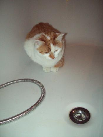 Er liebt es, in Waschbecken oder Badewanne zu sitzen, gerne auch, wenn noch ein paar Zentimeter Wasser drin stehen *gg*