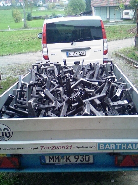 Da stand ich nun, ich armer Tor..... und hab geschuftet - und sah danach aus wie ein Schwein.... Als ich daheim in den Hof fuhr hieß es schon, "Wo warst Du denn so lange? Wir warten schon!" Als sie aber den Haufen auf dem Hänger sahen, war sofort Ruhe ;-) Das Allerbeste: Ich hätte gar nicht alles mitbringen müssen, ein Teil hätte schon gereicht und den Rest hätte unser Lieferant selber zusammenschweißen können *Augenverdreh* es geht doch nichts über eine gute Kommunikation im Geschäftsleben!