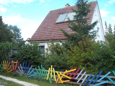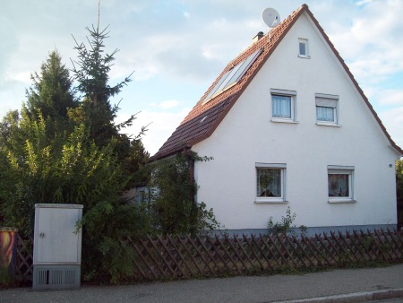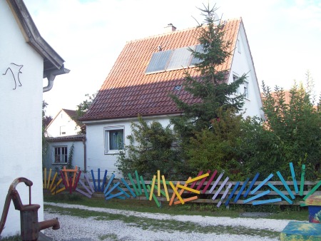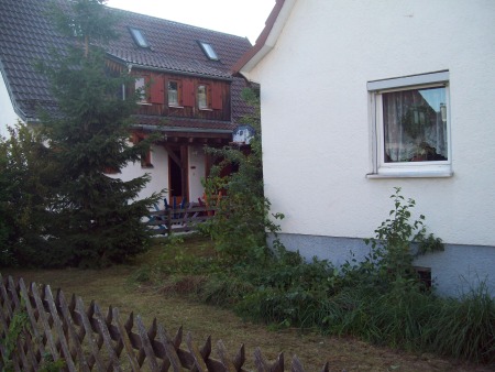 Warum Hexenhaus??? Weil das Häuschen das wir gemietet haben so aussieht. Es ist ein kleines, sehr verwinkeltes Häusle, hier ein Treppchen, dort ein Absatz, die Zimmer sind winzig und beim Einzug hatten wir nur 2 Ölöfen und im Bad ein Mordstrum an Boiler, den man erst mal stundenlang einheizen mußte um duschen oder baden zu können. Der Riesengarten steht voller Bäume und Büsche, total wild.