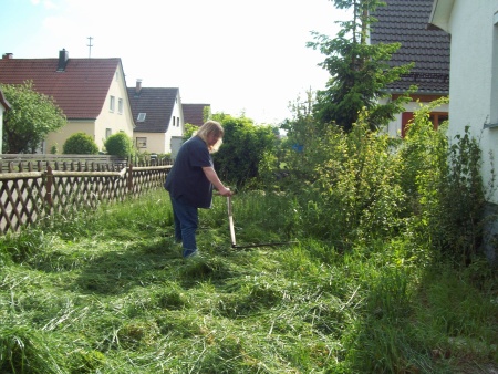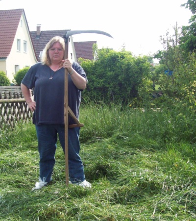 Da es immer dann, wenn ich Zeit hatte geregnet hat und immer dann, wenn ich absolut KEINE Zeit hatte die Sonne schien, war das Gras im Vorgarten (auf der Hundewiese *stöhn* Daher auch die neckischen Mülltütenschuhe - meine Gummistiefel passen nicht mehr) bereits arg hoch... ZU hoch für den armen Rasenmäher (ging mir locker über die Knie...) Da brachte mich mein Mann am Wochenende auf die Idee mit der Sense - ich wußte nicht mal, daß es sowas im Hexenhaus gibt!!!