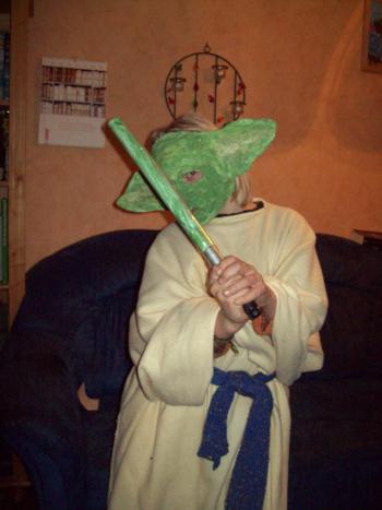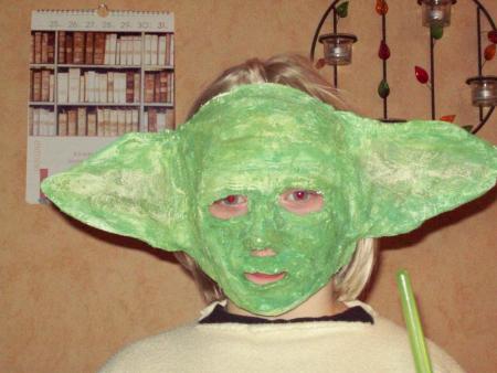 Ist ja auch alles kein Problem meint der Strolch.... da nehmen wir einen Luftballon und machen schnell aus Pappmaché eine Yoda-Maske..... ist ja auch soo einfach... pffft.... Der kleine Kerl hat Ideen *Seufz* Ein Laserschwert muß ich dann auch noch fabrizieren, logisch.