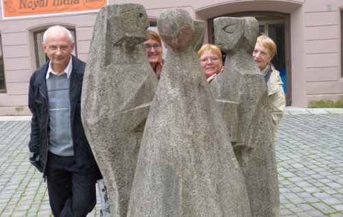 Die steinernen Herrschaften sind unsere „Ratschkatteln“, die Marktfrauen von Max Pöppel, einem Memminger Künstler.