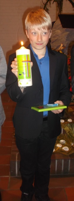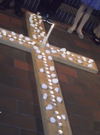 Gestern abend war schon der Beicht- und Abendmahlsgottesdienst. Unser neuer Pfarrer hat das SO schön gemacht! Vor dem Altar lag ein großes Holzkreuz. Erst hat er von all den schönen, den Glücksmomenten der letzten 12, 13 Jahre gesprochen und wir Eltern und Paten sollten da düber nachdenken und dann vorkommen, eine Kerze anzünden und aufs Kreuz legen...